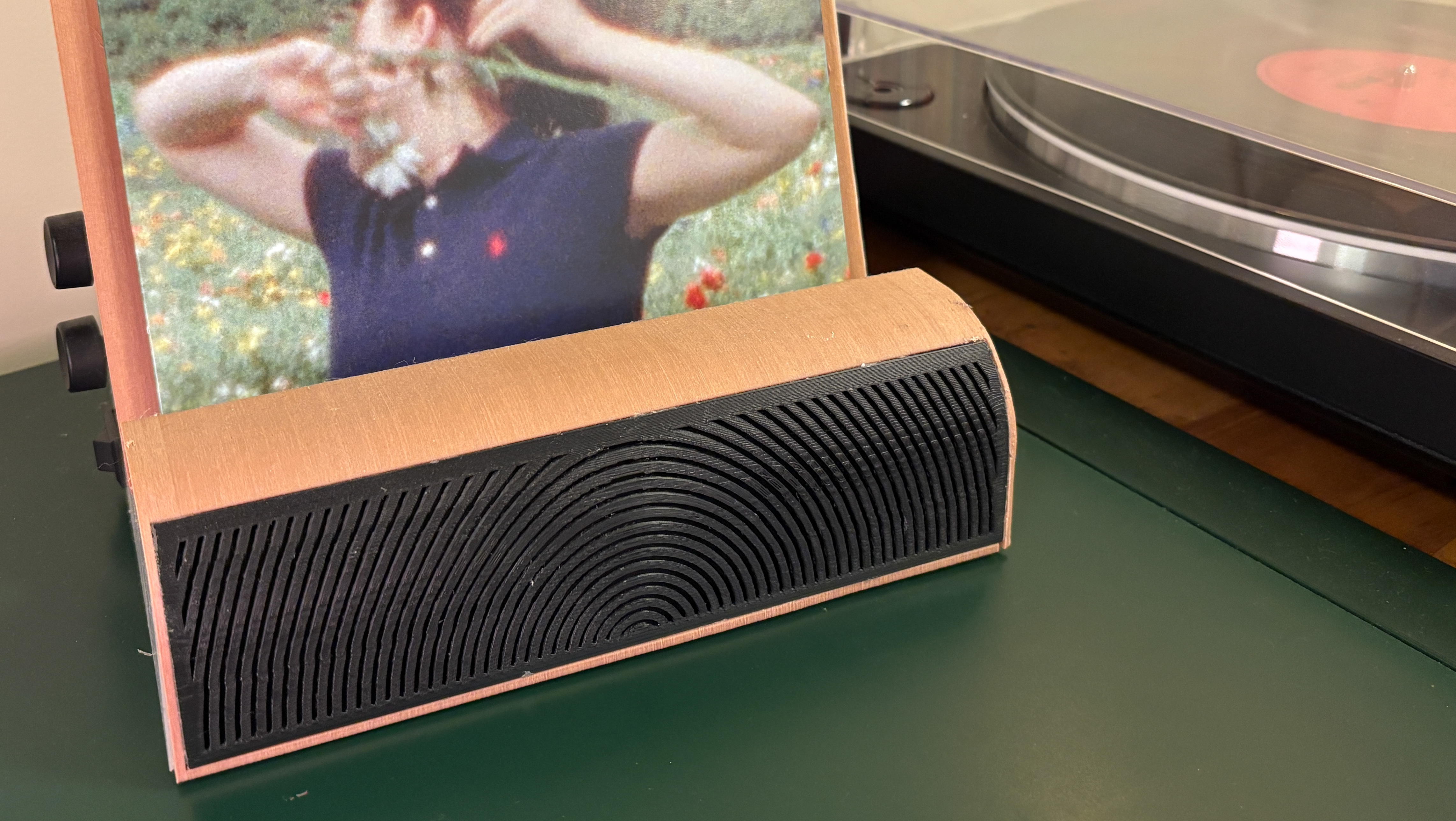 A small home speaker designed to display records while they are played